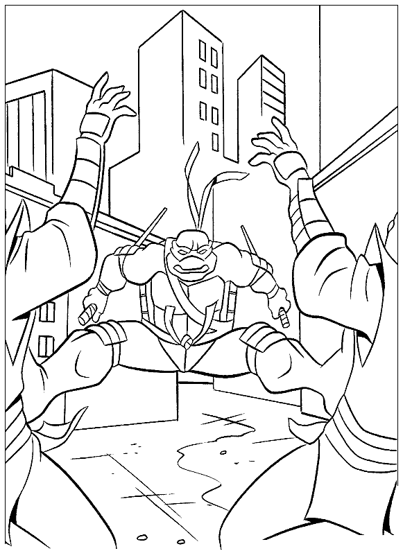 Leonardo ma wszystkie cechy prawdziwego lidera. Jest mistrzem w sztukach walki i dobrym taktykiem. Na obrazku widać jak pokonuje przestępców swoimi dwoma katanami. Przepaska na oczach Leonarda jest niebieska. Pokoloruj obrazek. Miłej zabawy!
