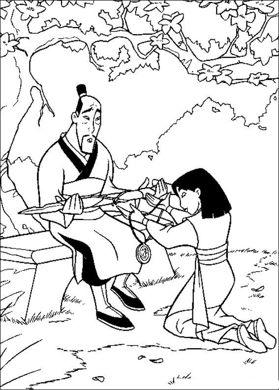 Mulan z ojcem- do drukuPrzez kolorowanki Mulan przebrana za mężczyznę wyrusza na wojnę w zastępstwie swojego ojca. Na obrazku widać jak oddaje mu miecz i pokazuje zdobyty medal za odwagę. Wydrukuj i pokoloruj obrazek ulubionymi kolorami. Powodzenia!