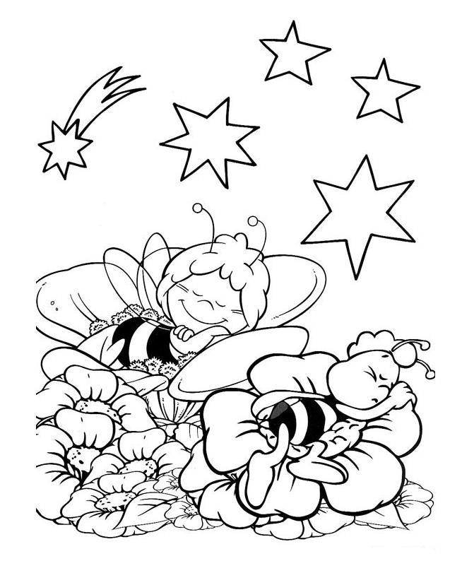 Maję i Gucia zmorzył sen. Małe pszczółki zasnęły na kwiatkach. Na niebie lśnią gwiazdy. Jedna spada. Czy wiesz co trzeba zrobić, gdy widzi się spadającą gwiazdę? Trzeba pomyśleć marzenie! Wydrukuj i pokoloruj obrazek najpiękniej jak potrafisz. Miłej zabawy!