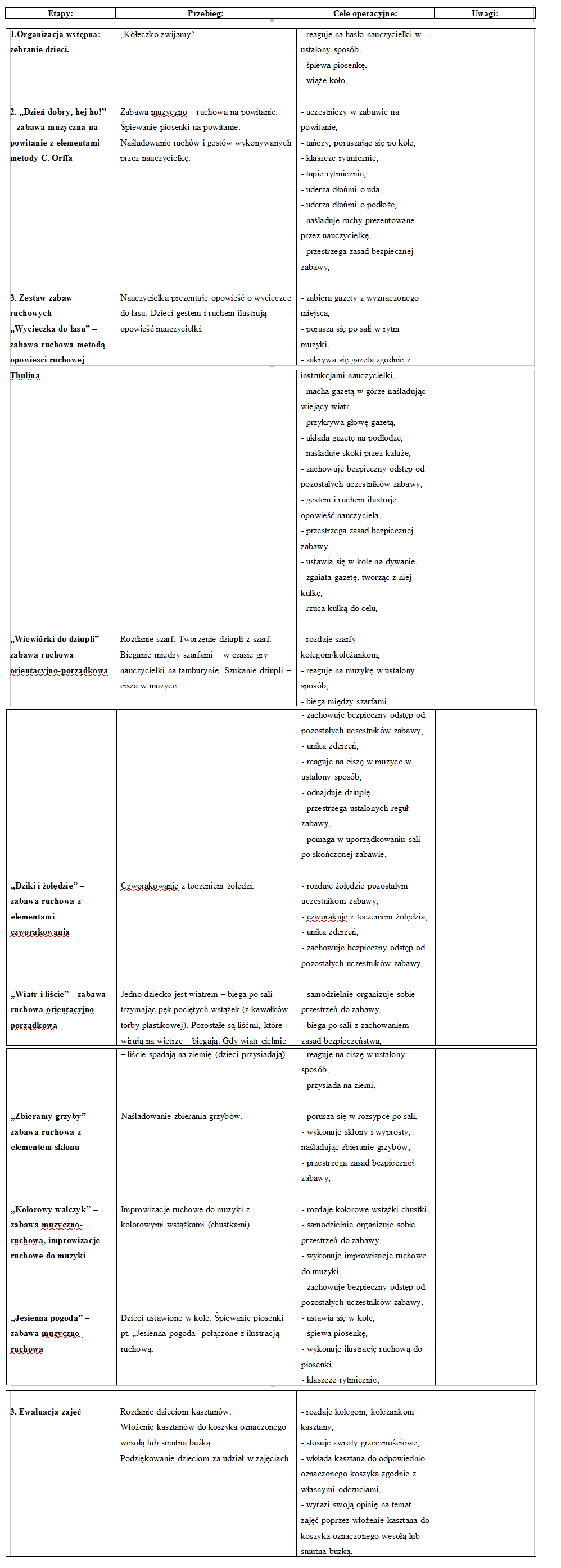 Środki dydaktyczne: płyta CD z nagraniem piosenki na powitanie oraz piosenki pt. „Jesienna pogoda”, nagranie walca a-mol F. Chopina, gazety, szarfy, żołędzie, kolorowe chustki, kasztany, koszyki, emblematy wesołej i smutnej buźki.